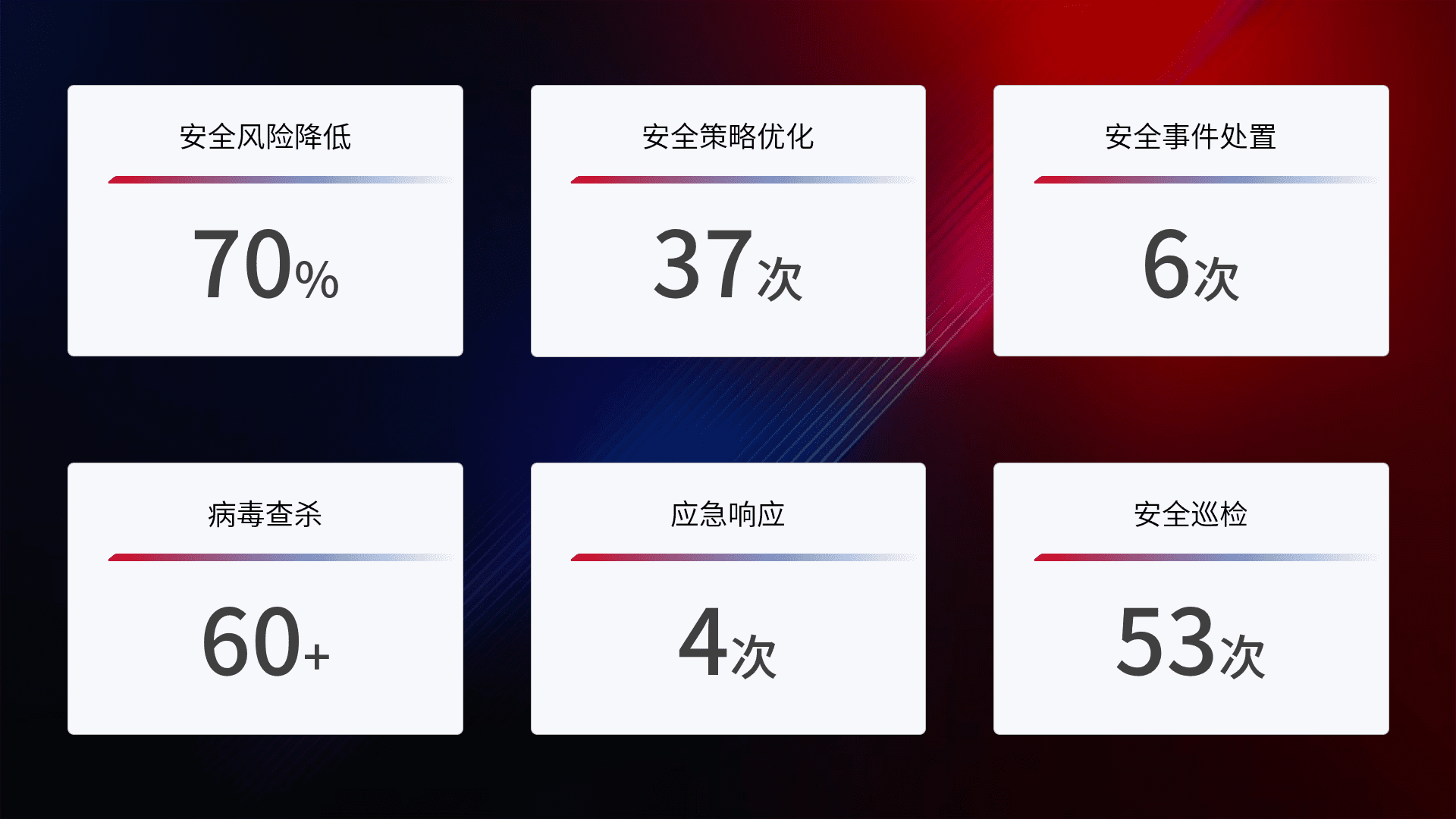 提供全面的安全事件报告体系,,,,包括处置报告、、周报、、、季度和年度总结,,,,结合持续监控,,帮助客户深入了解网络安全状况。。。。