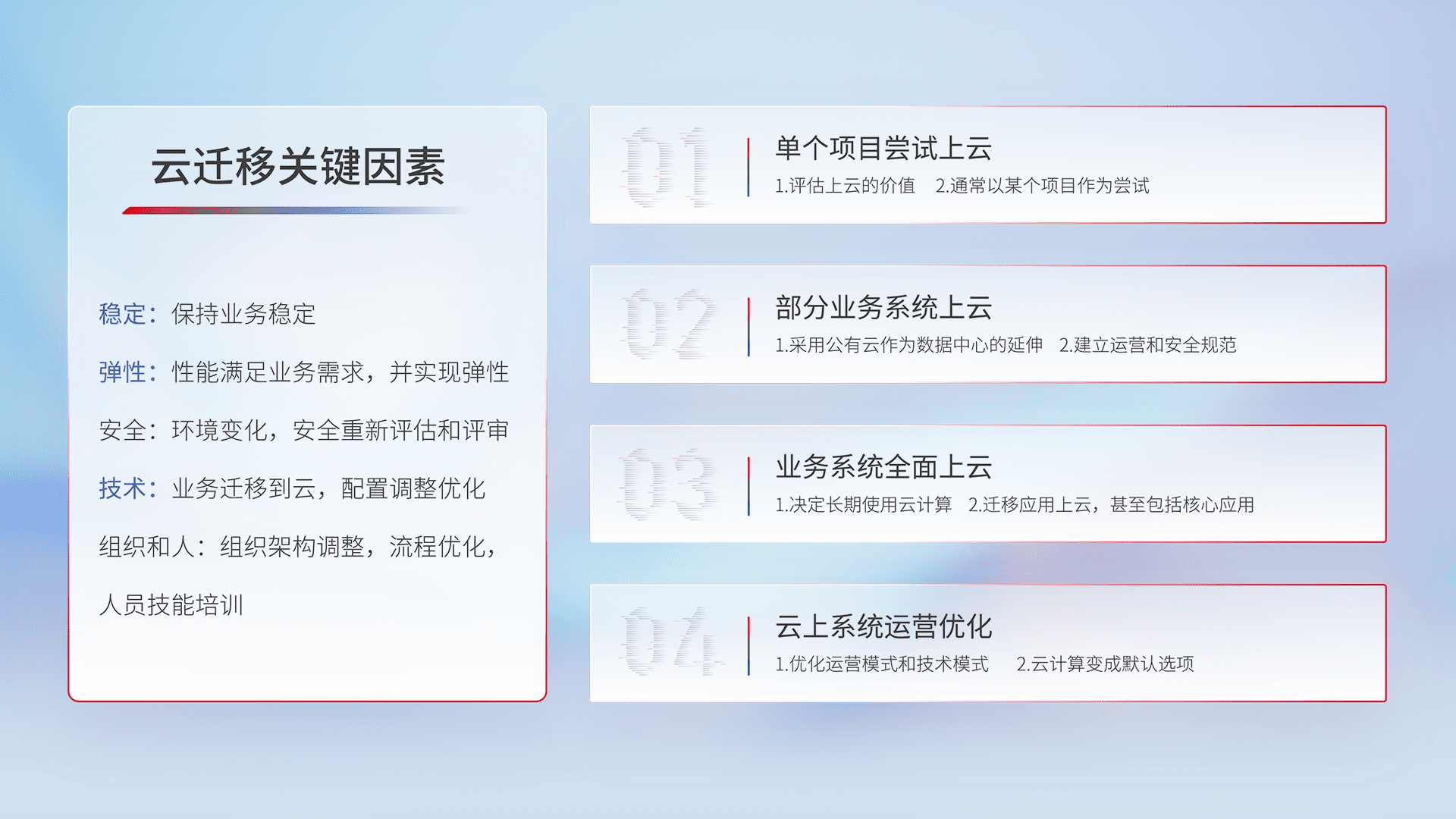 结合实际业务,,,,从规划设计、、、、云平台选型、、云原生改造、、数据迁移、、集成交付,,,,迁移全过程为客户识别最佳上云路径,,,做好风险识别管理,,,,设计网络架构、、身份权限、、、安全审计合规、、操作审计、、、日志审计、、、监控告警策略、、多站点容灾设计等,,,对云上基础设施进行整体规划,,,,提升IT治理水平,,,,以满足弹性、、、、高可用、、、高性能的需求。。。