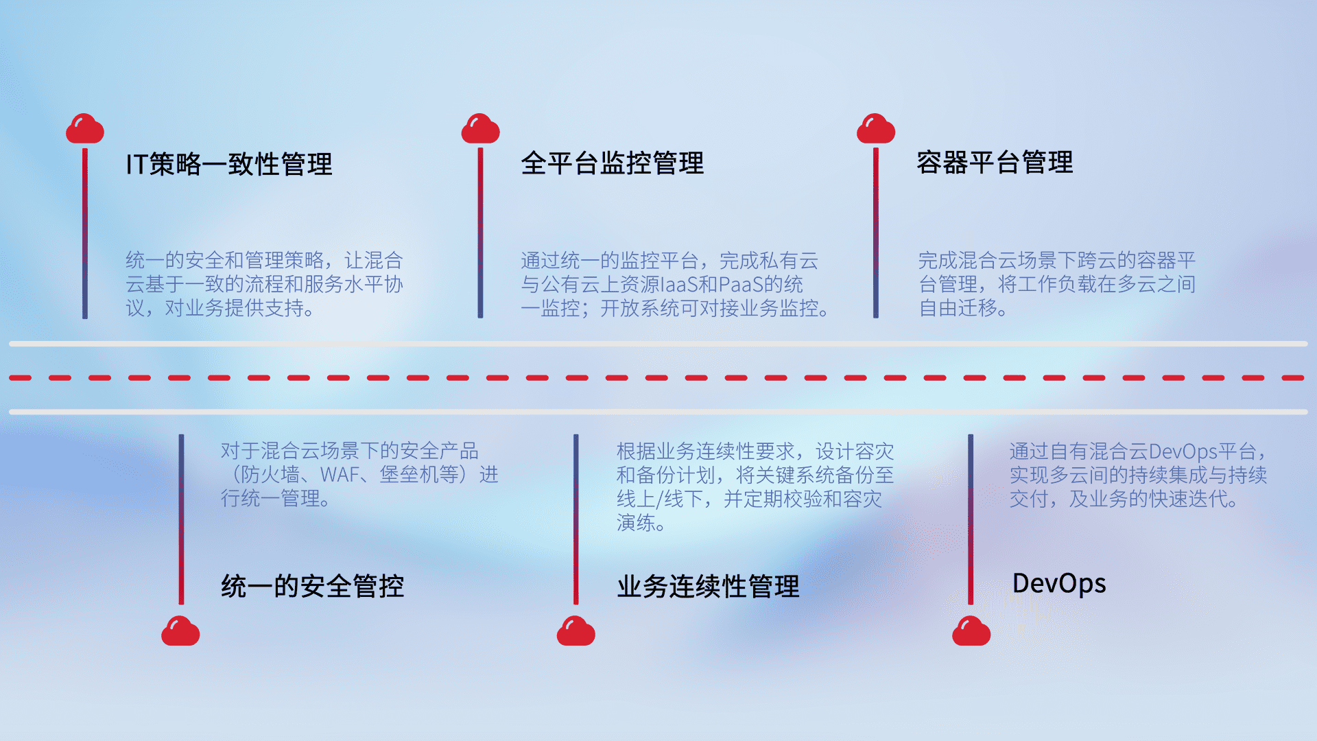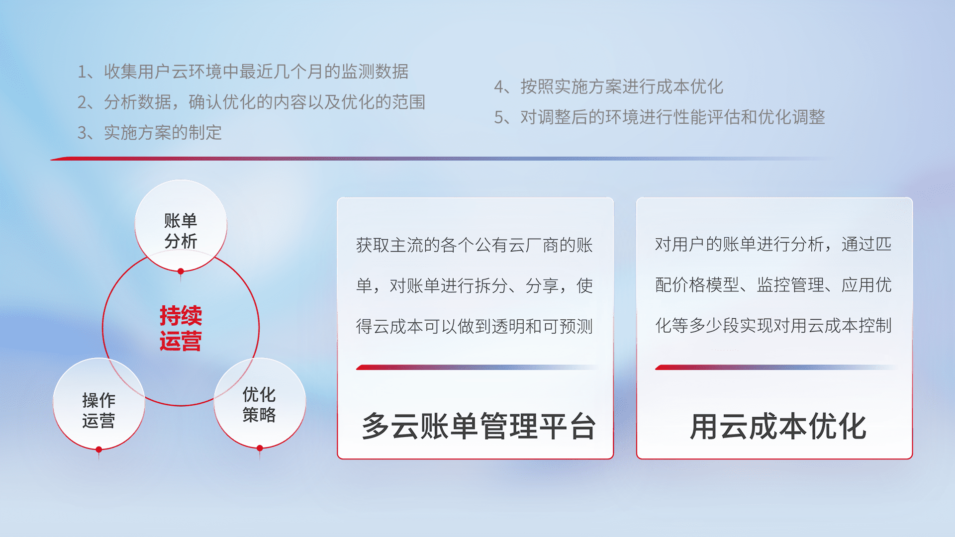 通过多云纳管,,,,以统一的资源数据模型把客户的云资源进行抽象和封装,,进而实现对多云资源的统一操作,,,保障云资源管理的可靠性、、、稳定性与可用性。。。。量身定制化运维内容,,,,配置、、、、开发运维、、、、补丁管理、、备份、、、、监控、、、、认证和访问管理、、审计和日常巡检等,,,保障在用云过程中的可靠度,,,,稳定度以及高可用率。。。。