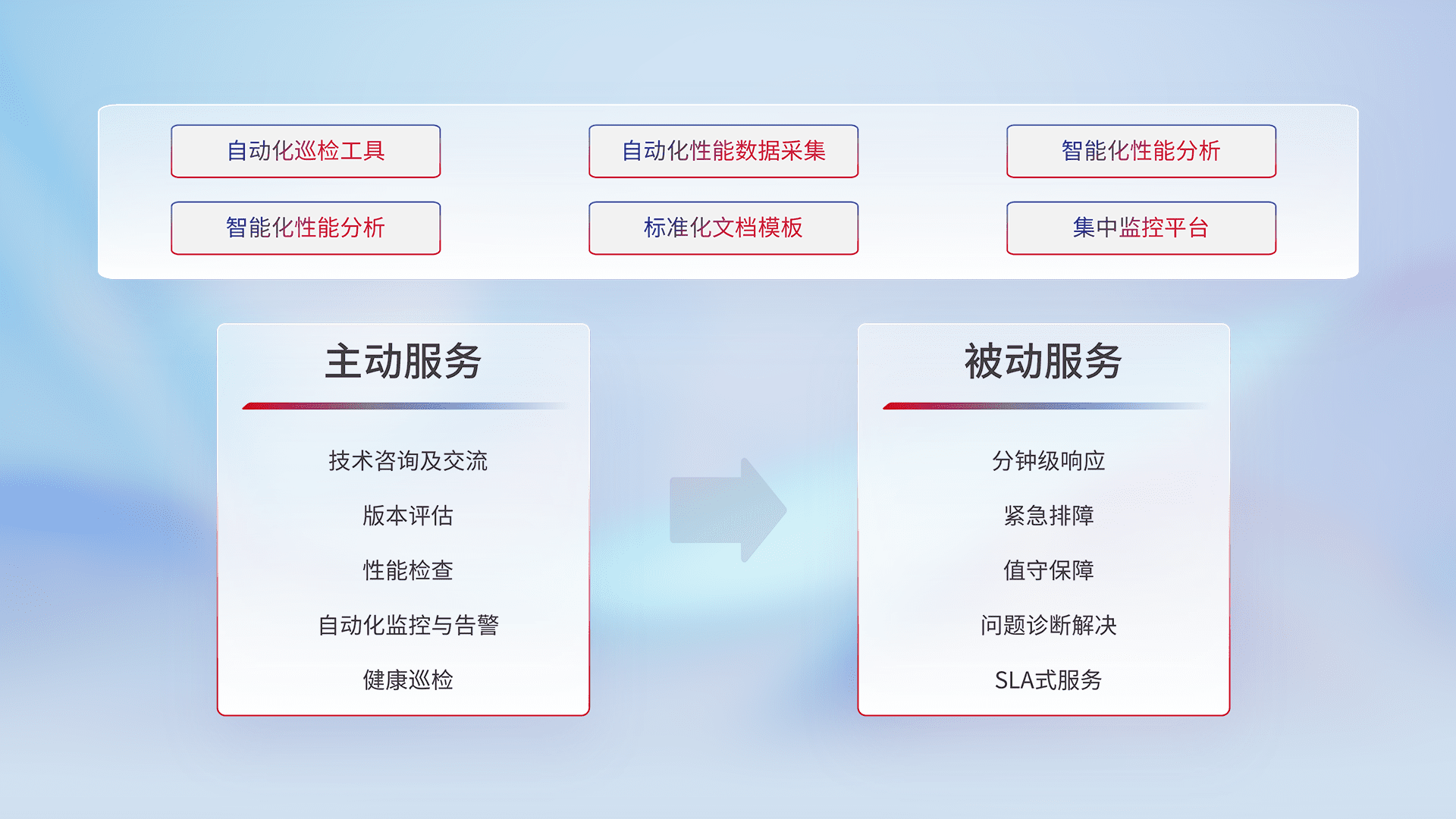 智能化工具和标准化文档,,保障服务质量,,,提供主动服务(包含技术咨询、、、版本评估、、性能检查、、、自动化监控与告警、、、健康巡检)和被动服务包含(分钟级响应、、、紧急排障、、、、值守保障、、问题诊断解决、、、、SLA服务)。。。。